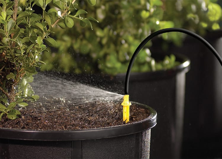 The Netafim Spray Stake pattern is specifically designed to match the shape of the pot and provide a precise amount of water and fertilizer directly to the plant. The pattern wets the soil surface evenly to maximize water retention by the soil mix and evenly release liquid or timed-release fertilizers. Overspray or water run-off is eliminated saving water, energy and fertilizer costs.